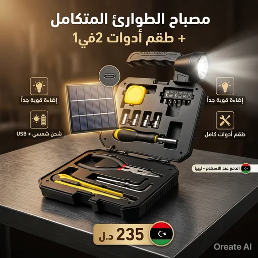 ✔ ضو LED قوي وواضح ✔ يشحن بالطاقة الشمسية (اقتصادي وصديق للبيئة) ✔ خفيف وسهل الحمل ✔ صندوق أدوات مدمج ومنظم ✔ يخدم حتى في الأماكن اللي مافيهاش كهرباء ✔ مثالي للطوارئ والرحلات ✔ سهل الاستخدام لأي حد